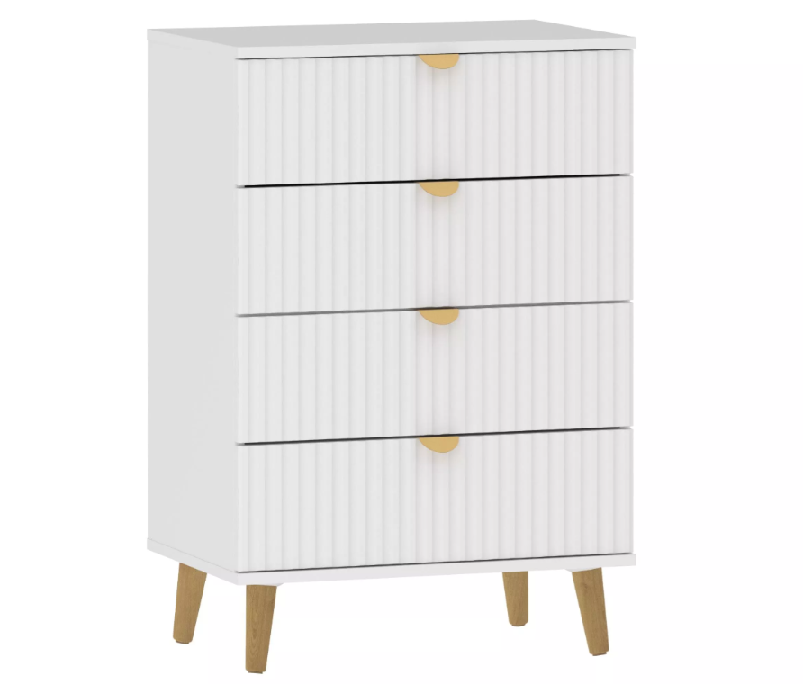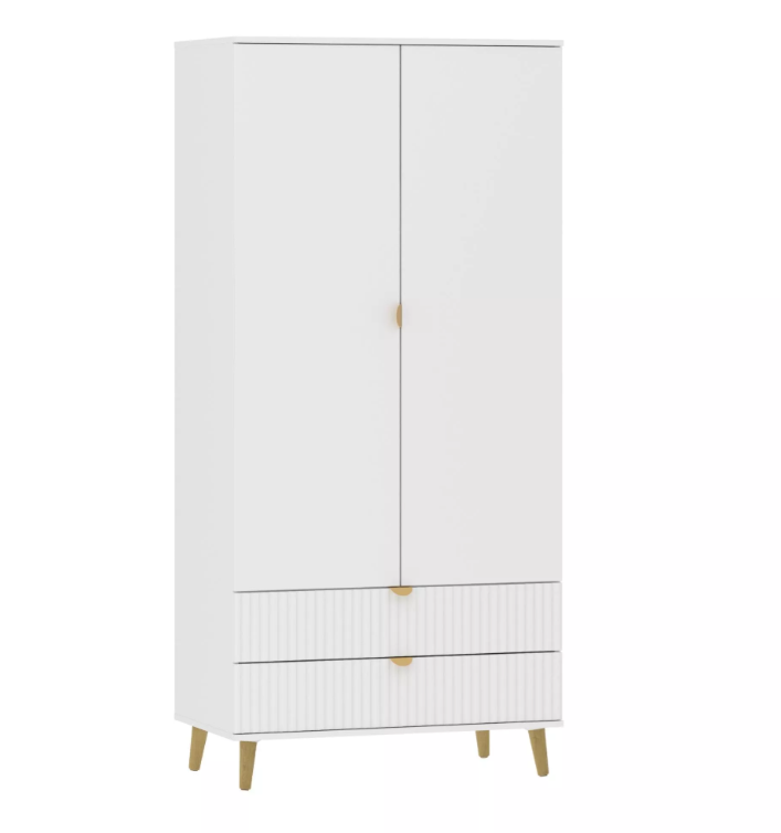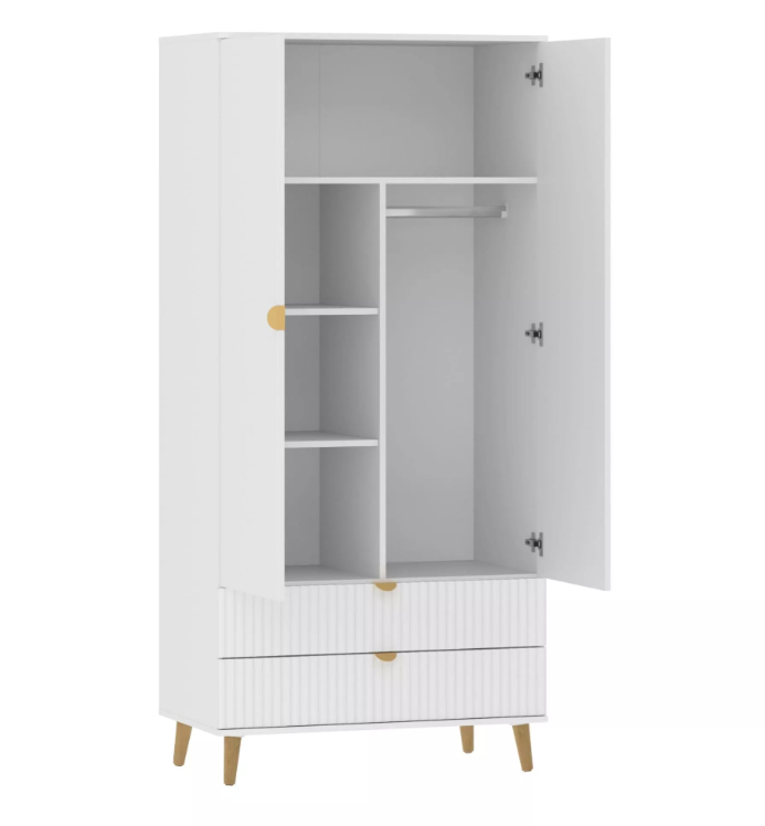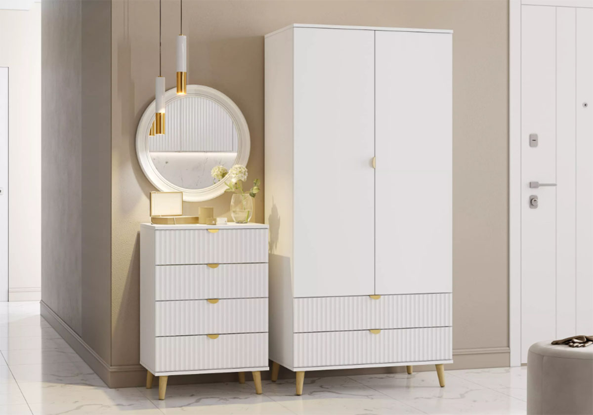 Модульная композиция включает комод, оснащенный выдвижными ящиками, которые открываются плавно и бесшумно благодаря шариковым направляющим, а в шкафу удобно организовать предметы одежды, при этом высокие опоры облегчают процесс уборки.
