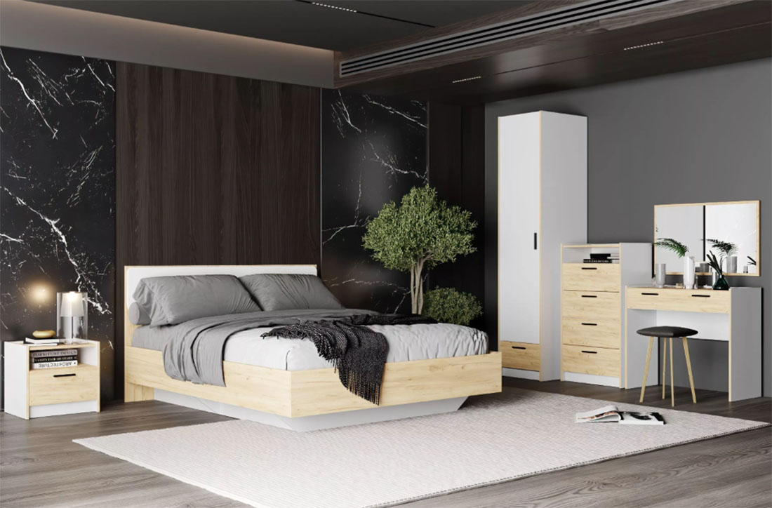 Модульная композиция включает кровать с оригинальным парящим эффектом, который облегчает уборку в комнате, а в ящике можно удобно разместить постельное белье. Система хранения представлена одностворчатым шкафом и комодом, в которых можно рассортировать одежду на полках и в выдвижных ящиках. Все необходимые документы будут всегда под рукой на полках прикроватной тумбы. Завершает композицию зеркало с туалетным столиком, где можно расположить косметику или украшения.