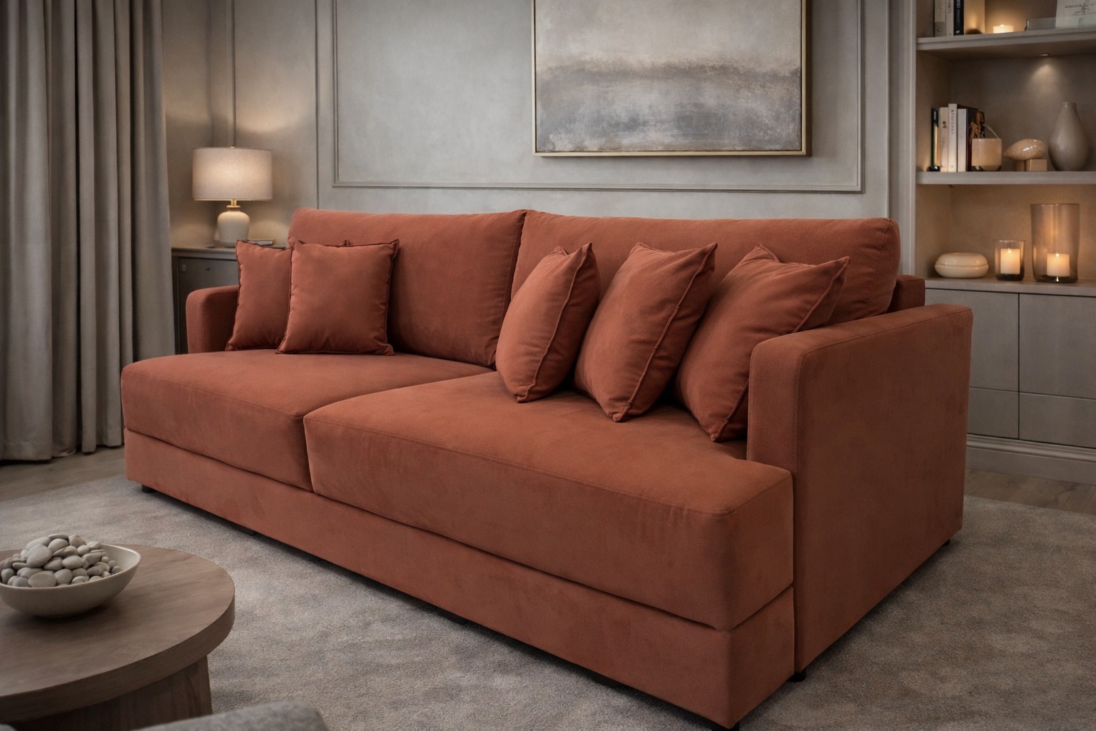 Современный прямой диван гармонично впишется в интерьер гостиной, спальни или зоны отдыха. Лаконичная форма, мягкие линии и объемные подушки создают аккуратный и уютный внешний вид.