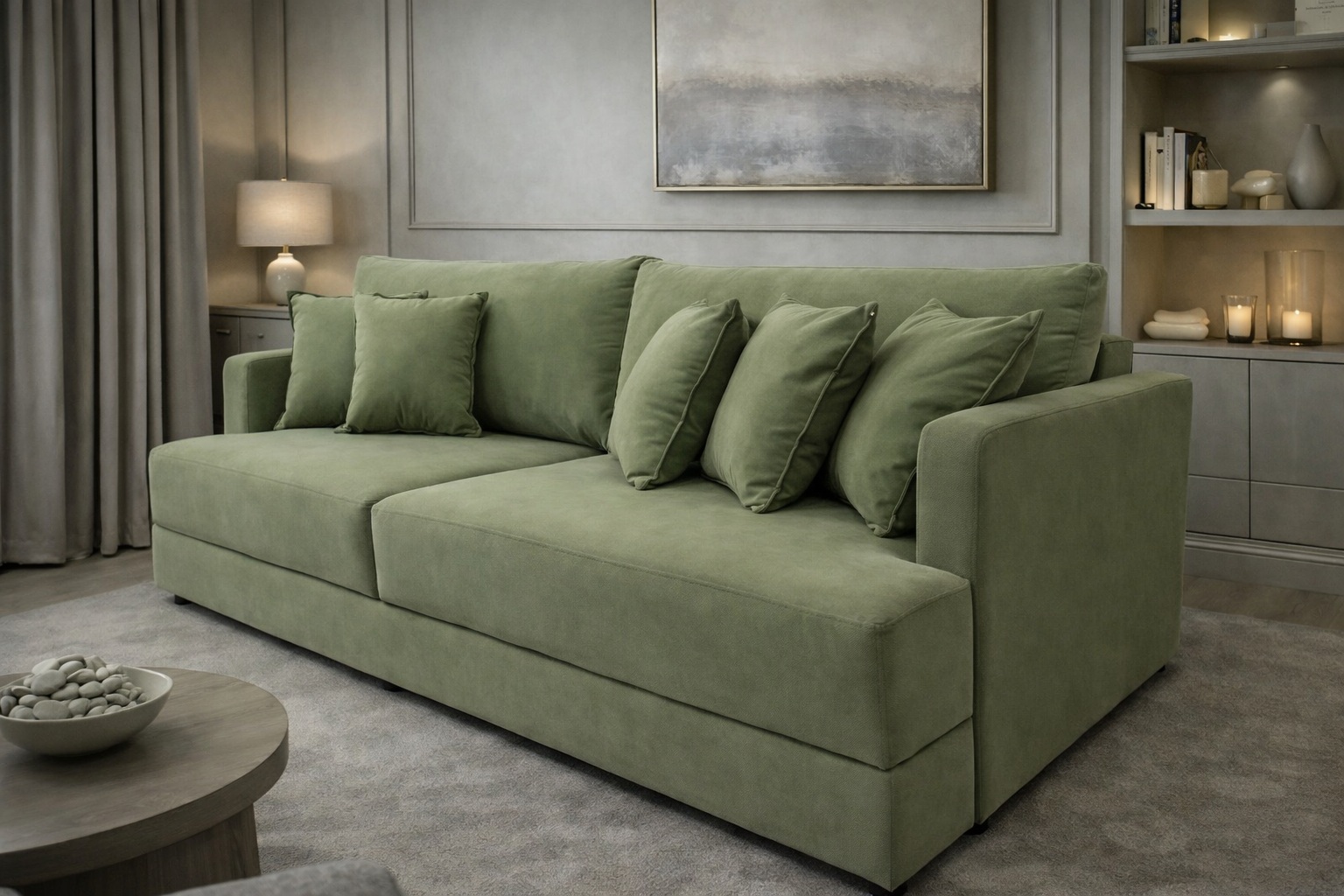 Современный прямой диван гармонично впишется в интерьер гостиной, спальни или зоны отдыха. Лаконичная форма, мягкие линии и объемные подушки создают аккуратный и уютный внешний вид.