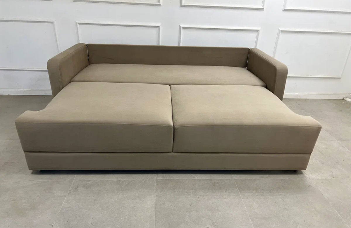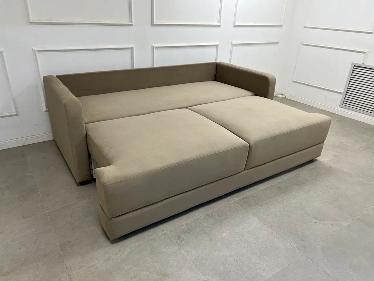 Диван с глубиной сиденья 84 см без учета подушек обеспечивает комфортную и свободную посадку. Общие габариты дивана составляют 215×112×93 см, что позволяет удобно разместить его в гостиной или спальне. В разложенном виде диван образует спальное место размером 155×190 см, подходящее для ежедневного сна.