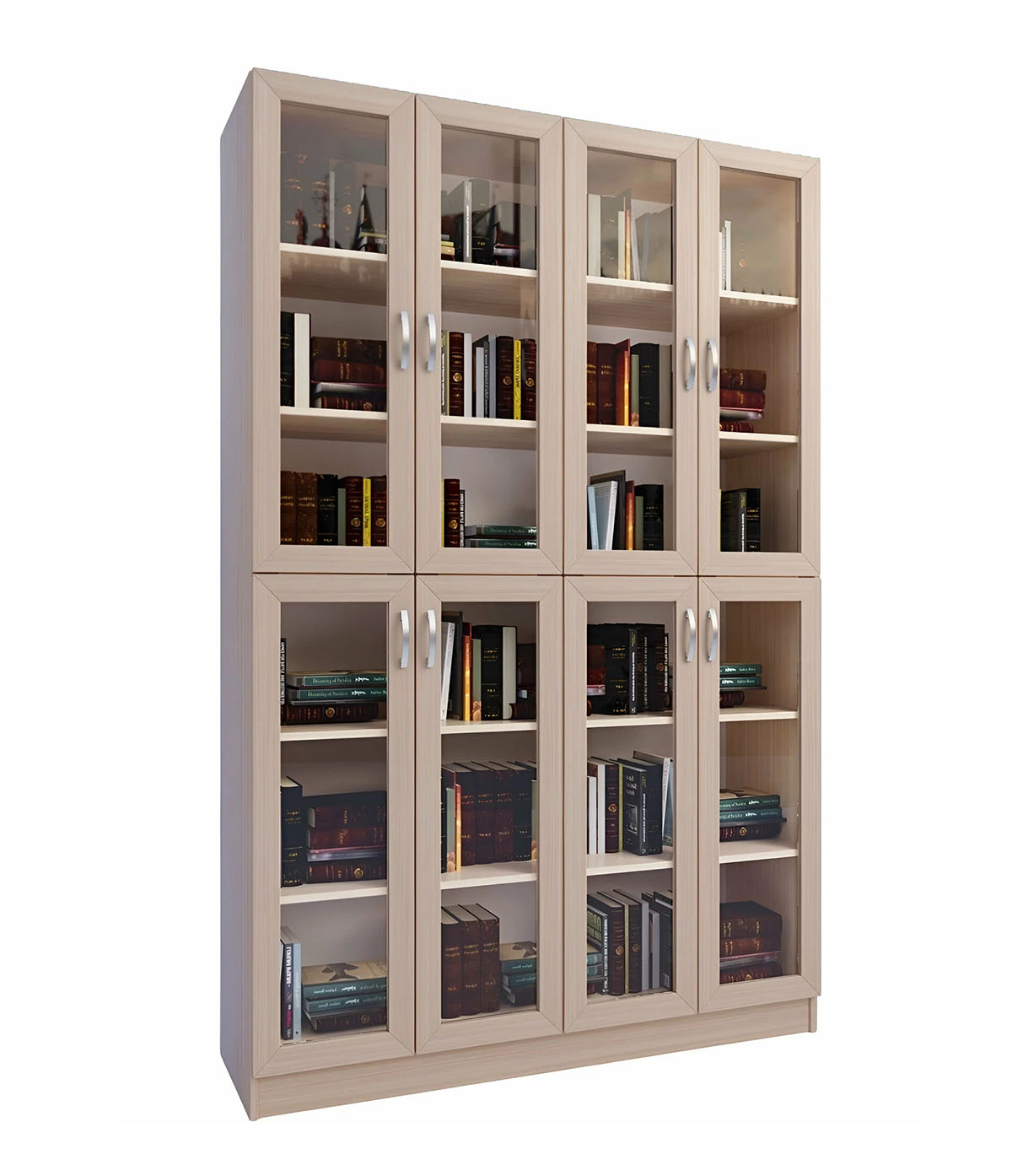 Шкаф оснащен 8 распашными дверями, каждая из которых выполнена из стекла, что добавляет ему легкости и воздушности. Материал корпуса - ЛДСП, а фасад выполнен из МДФ и стекла, что обеспечивает прочность и долговечность конструкции. Фурнитура изготовлена из металла, что гарантирует надежность и устойчивость к износу.