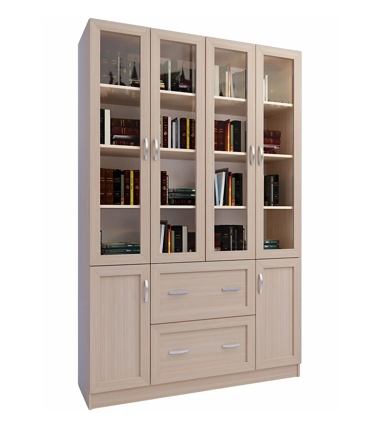 Шкаф оснащен 8 полками, 2 ящиками и 6 распашными дверями. Это позволяет удобно разместить книги, документы и другие предметы.