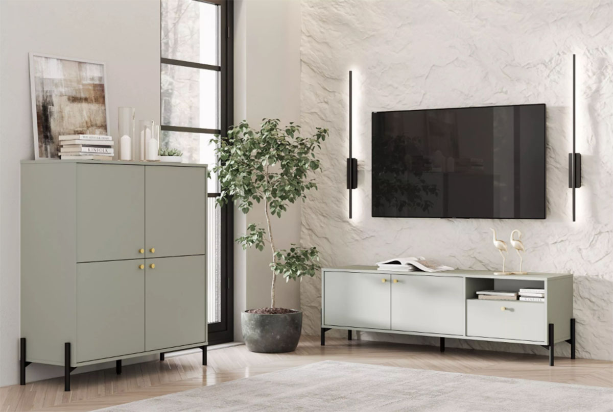 Комплектация №3 включает тумбу ТВА, на закрытых полках которой можно разместить видео- и аудиоаппаратуру. Завершает композицию тумба, в которую удобно положить одежду или другие вещи, а высокие опоры изделий обеспечивают быстрый и комфортный доступ при уборке.