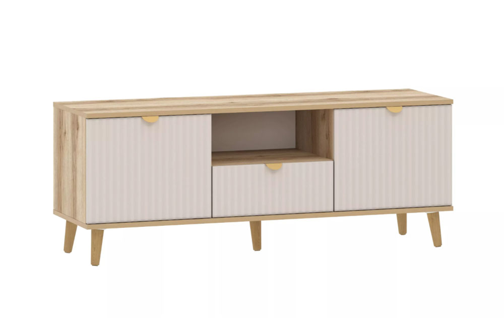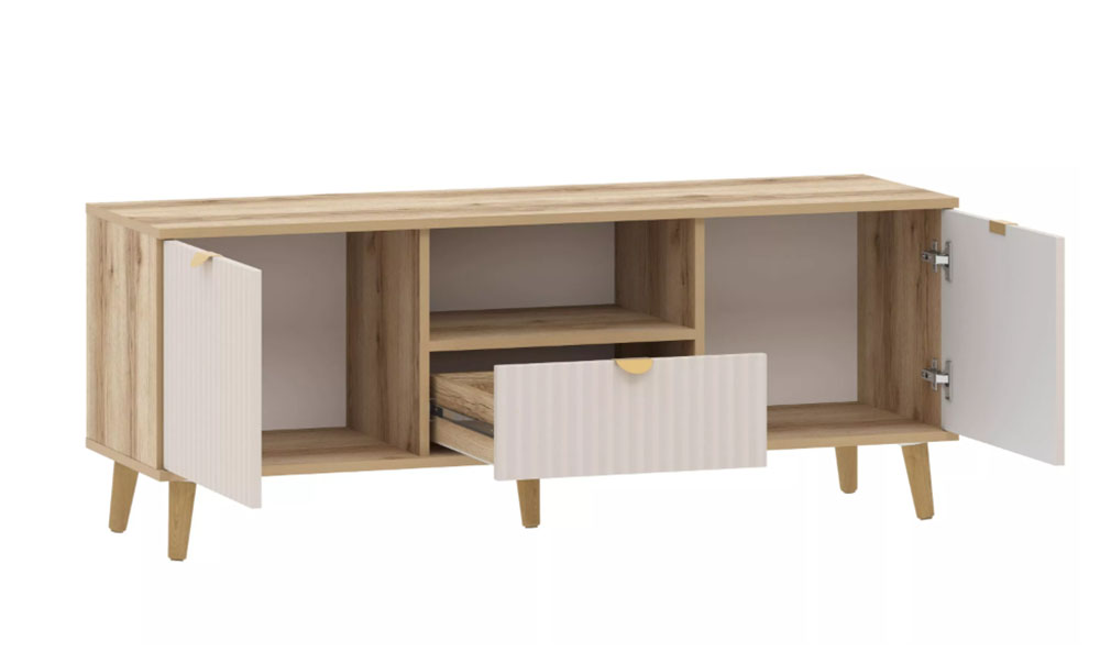 Модульная композиция включает комод и тумбу ТВА, оснащенные выдвижными ящиками, которые открываются плавно и бесшумно благодаря шариковым направляющим, а в шкафу удобно организовать книги, предметы декора или посуду, при этом высокие опоры облегчают процесс уборки.