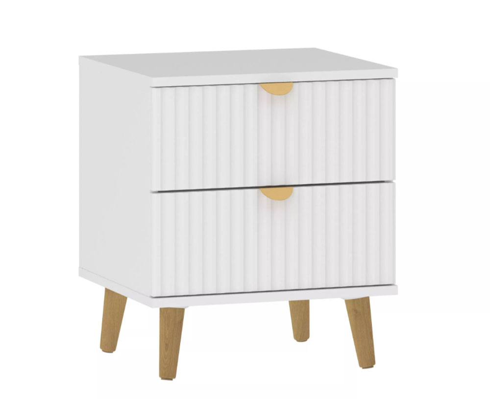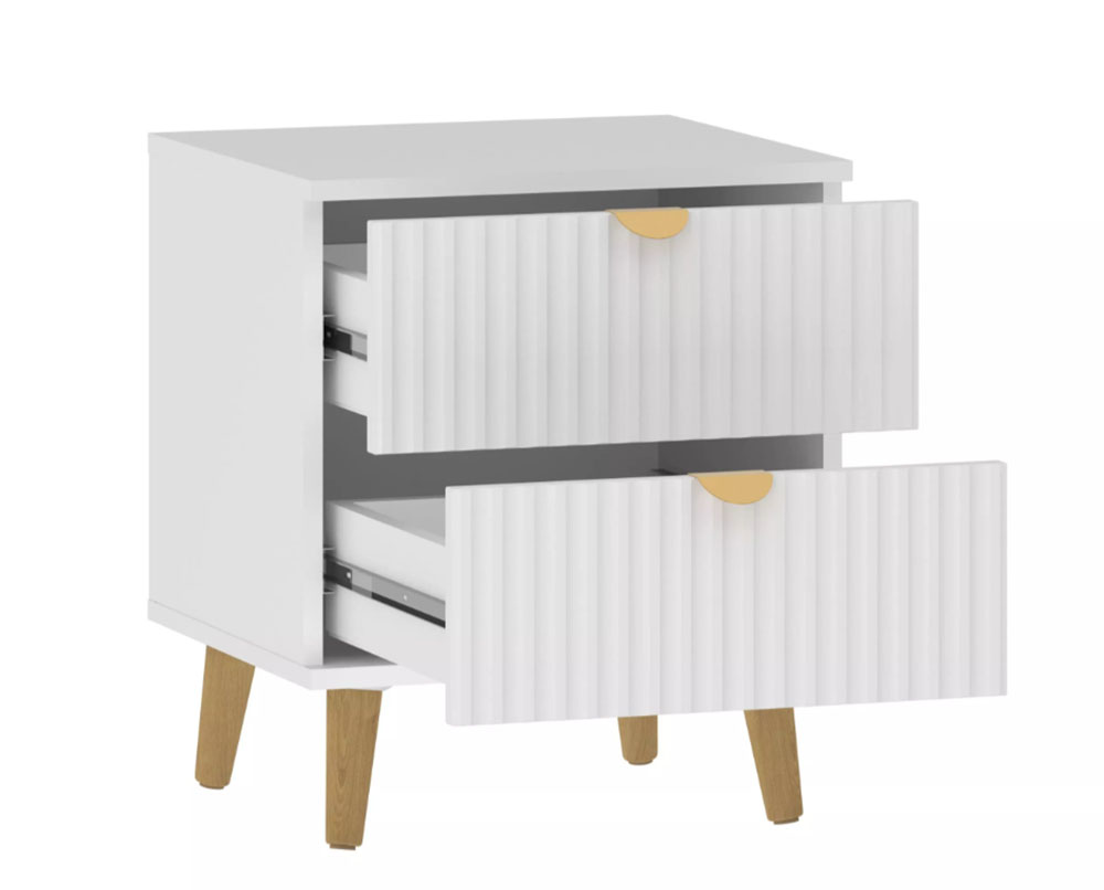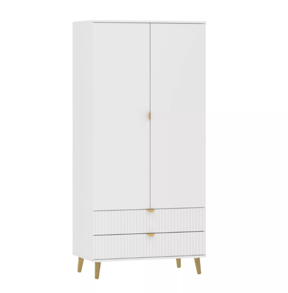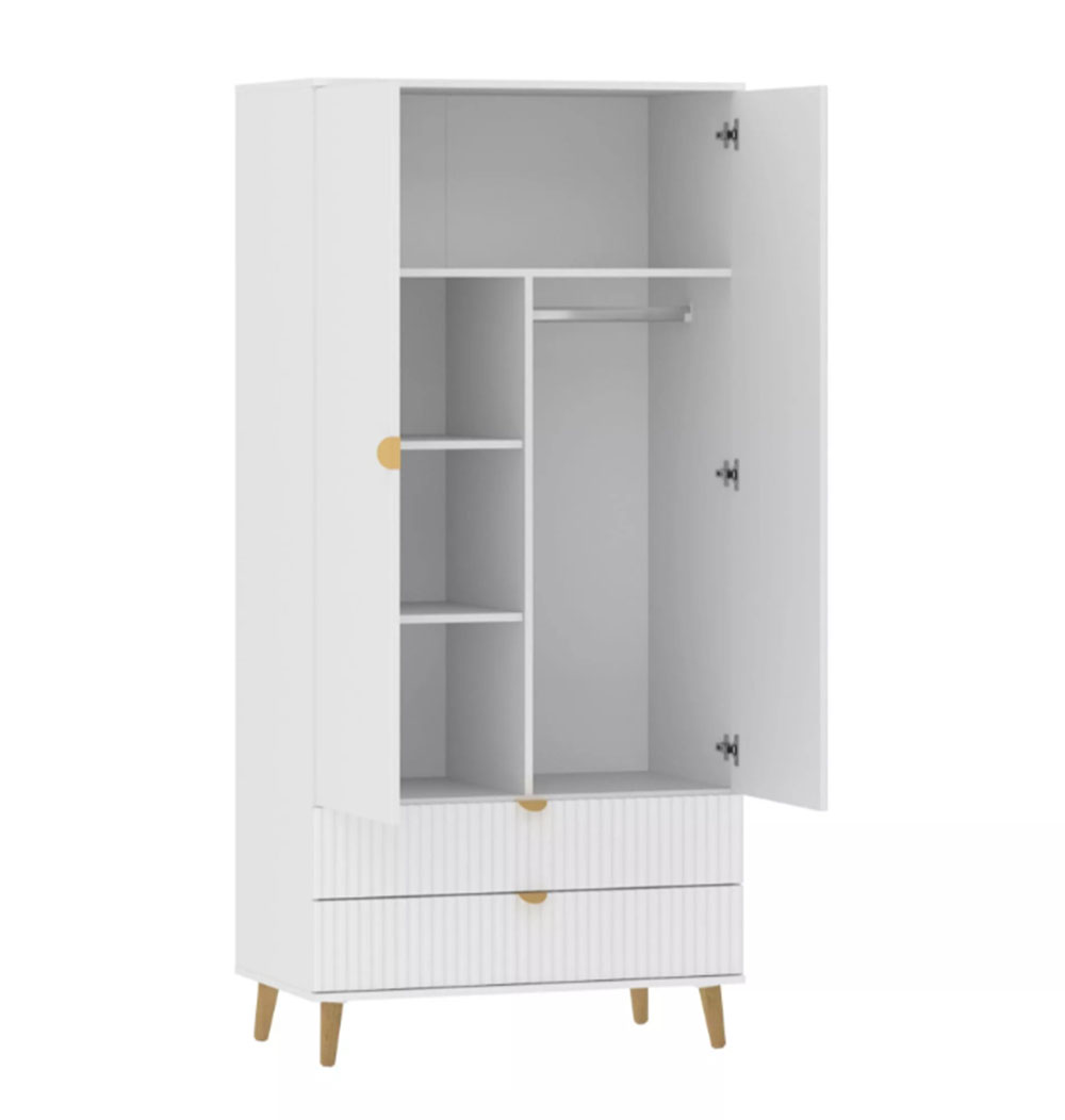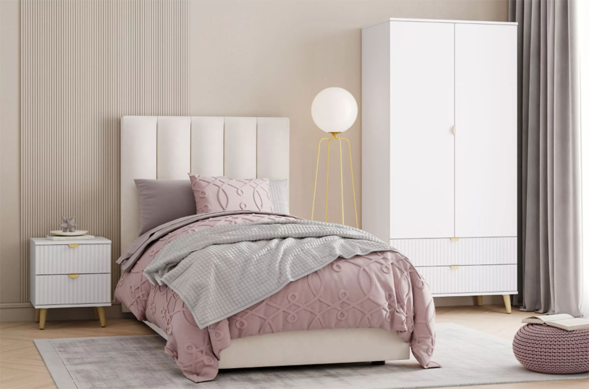 Модульная композиция включает прикроватную тумбу, оснащенную выдвижными ящиками, которые открываются плавно и бесшумно благодаря шариковым направляющим, а в шкафу удобно организовать предметы одежды, при этом высокие опоры облегчают процесс уборки.