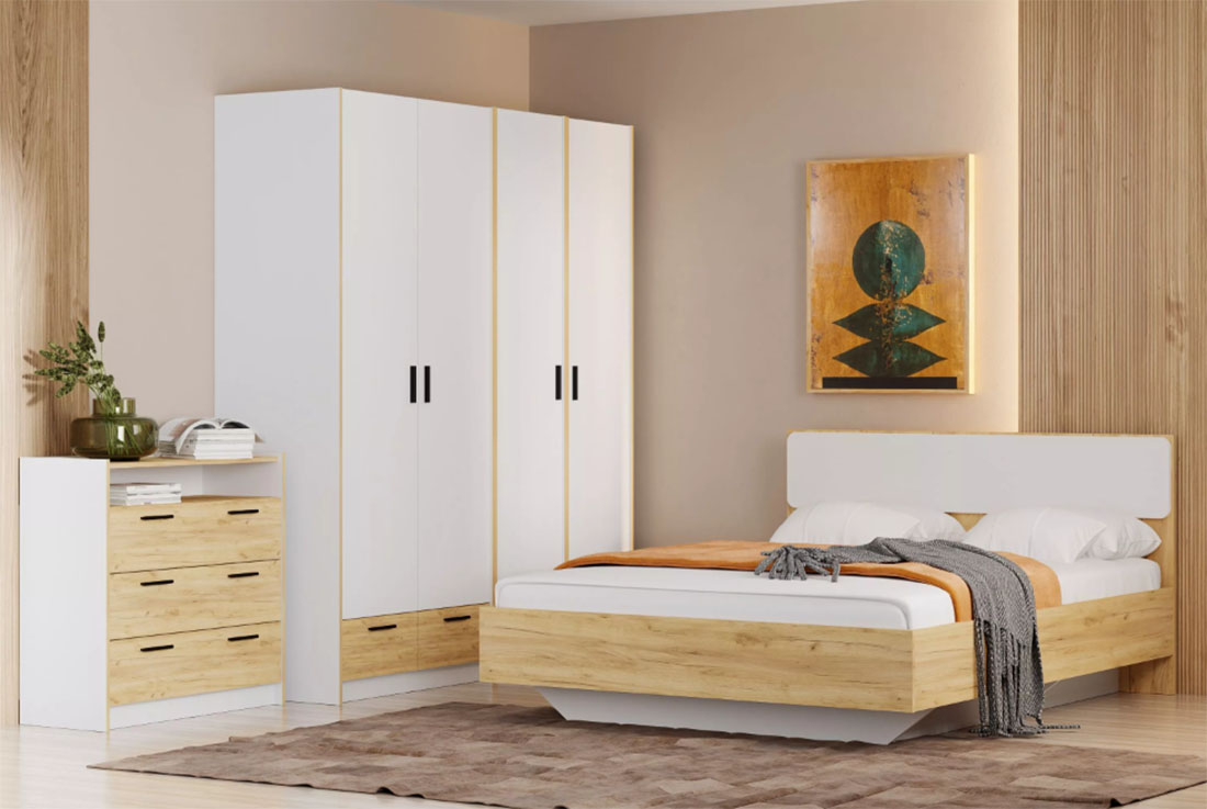 Модульная композиция включает кровать с оригинальным парящим эффектом, который облегчает уборку в комнате, а во встроенном ящике можно хранить постельное белье. Все необходимые документы будут всегда под рукой в выдвижных ящиках комода, а система хранения представлена двустворчатым и одностворчатыми шкафами для оптимальной организации предметов гардероба.