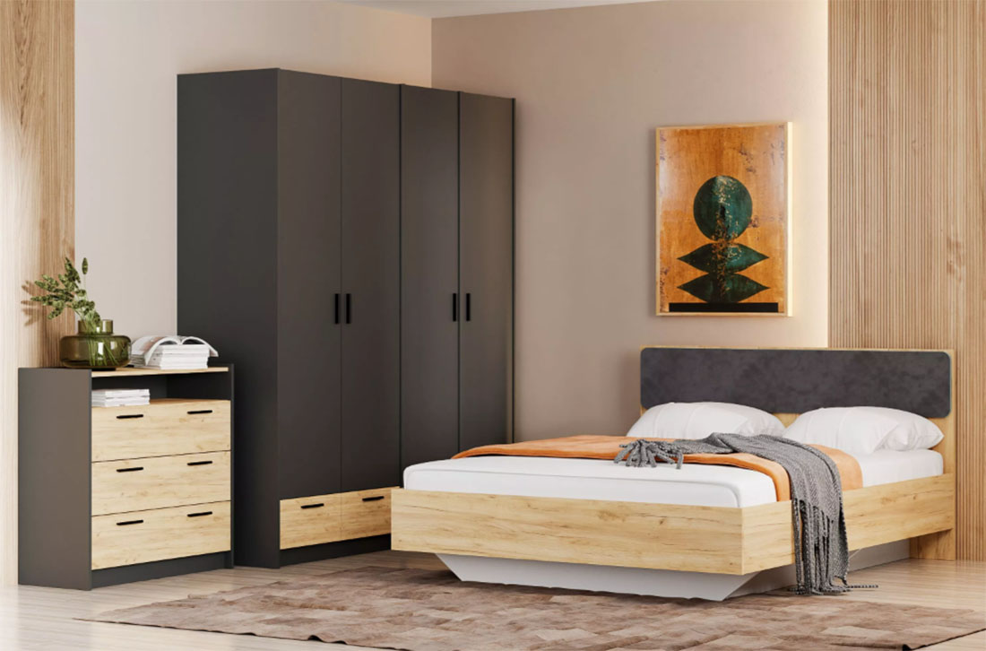 Модульная композиция включает кровать с оригинальным парящим эффектом, который облегчает уборку в комнате, а во встроенном ящике можно хранить постельное белье. Все необходимые документы будут всегда под рукой в выдвижных ящиках комода, а система хранения представлена двустворчатым и одностворчатыми шкафами для оптимальной организации предметов гардероба.