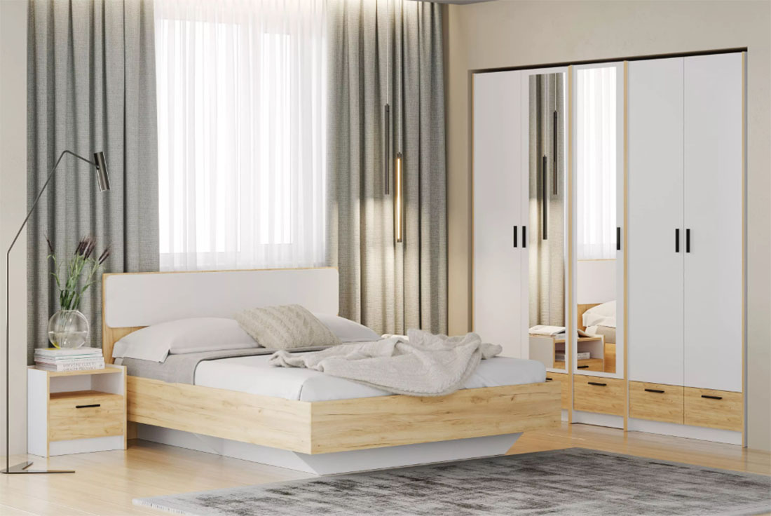 Модульная композиция включает кровать с оригинальным парящим эффектом, который облегчает уборку в комнате, а во встроенном ящике можно хранить постельное белье. Все необходимые документы будут всегда под рукой на полках прикроватной тумбы, а система хранения представлена двустворчатыми и одностворчатым шкафами для оптимальной организации предметов гардероба.