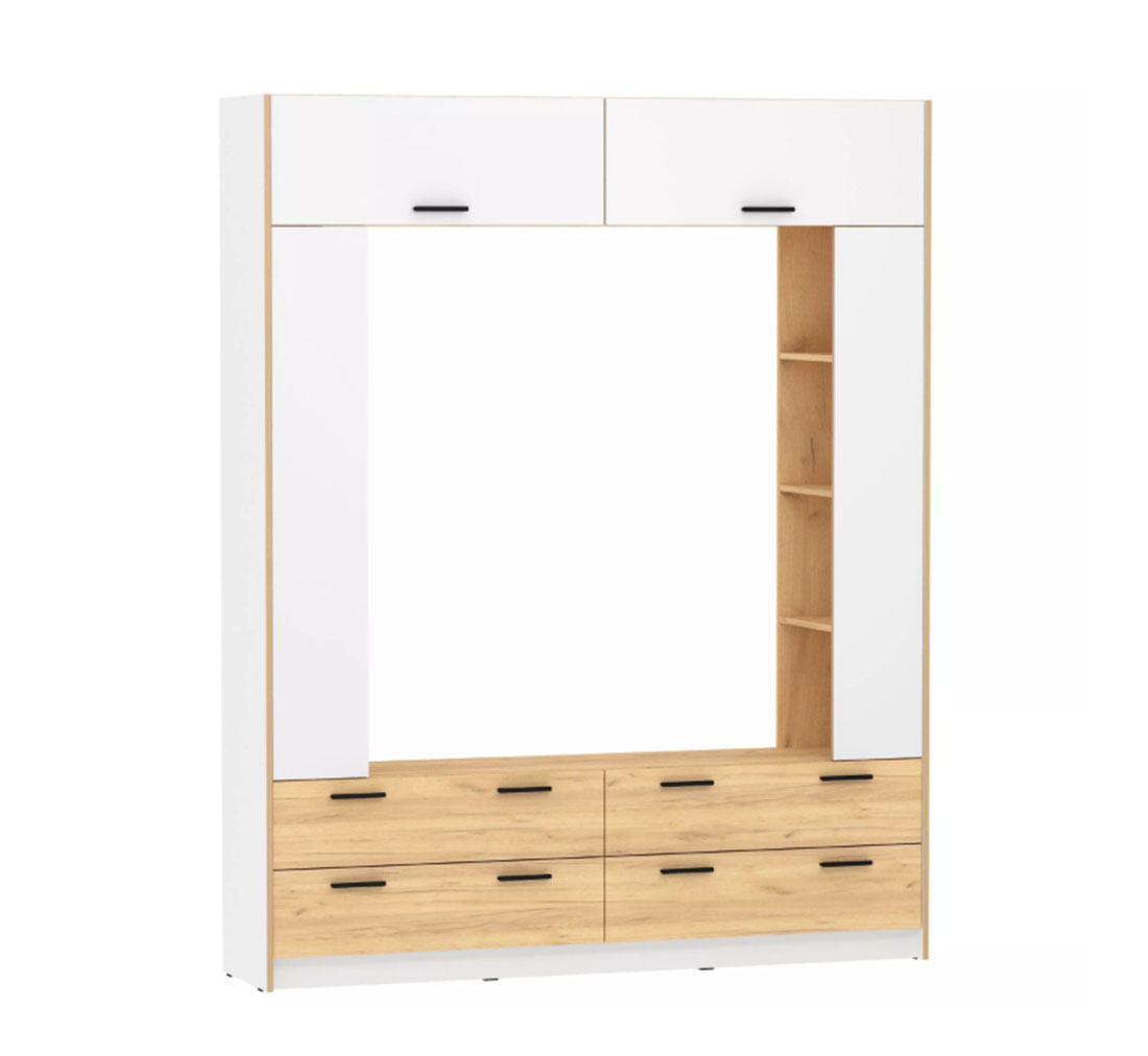 Модульная композиция включает комбинированный шкаф с двумя полками в верхей части стенки, четырьмя выдвижными ящиками в нижней части стенки, а также скрытыми полками за двумя распашными дверками. Шкаф-пенал оснащен полкой для хранения вещей, которая открывается с помощью газлифтов, фиксирующими положение фасада в открытом виде, а также двумя выдвижными ящиками с шариковыми направляющими, за счет которых они выдвигаются плавно и бесшумно. Шкаф оснащен полкой для хранения вещей, двумя выдвижными ящиками с шариковыми направляющими, за счет которых они выдвигаются плавно и бесшумно, а также выдвижной штангой, которая позволяет комфортно размещать предметы гардероба. Сочетание открытых и закрытых ниш добавляет легкости в интерьер, а также позволяет поместить красивую посуду или декор в видимой части изделия.