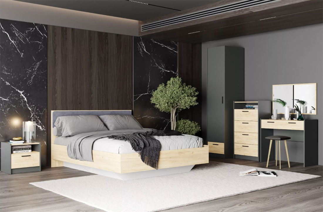 Модульная композиция включает кровать с оригинальным парящим эффектом, который облегчает уборку в комнате, а в ящике можно удобно разместить постельное белье. Система хранения представлена одностворчатым шкафом и комодом, в которых можно рассортировать одежду на полках и в выдвижных ящиках. Все необходимые документы будут всегда под рукой на полках прикроватной тумбы. Завершает композицию зеркало с туалетным столиком, где можно расположить косметику или украшения.